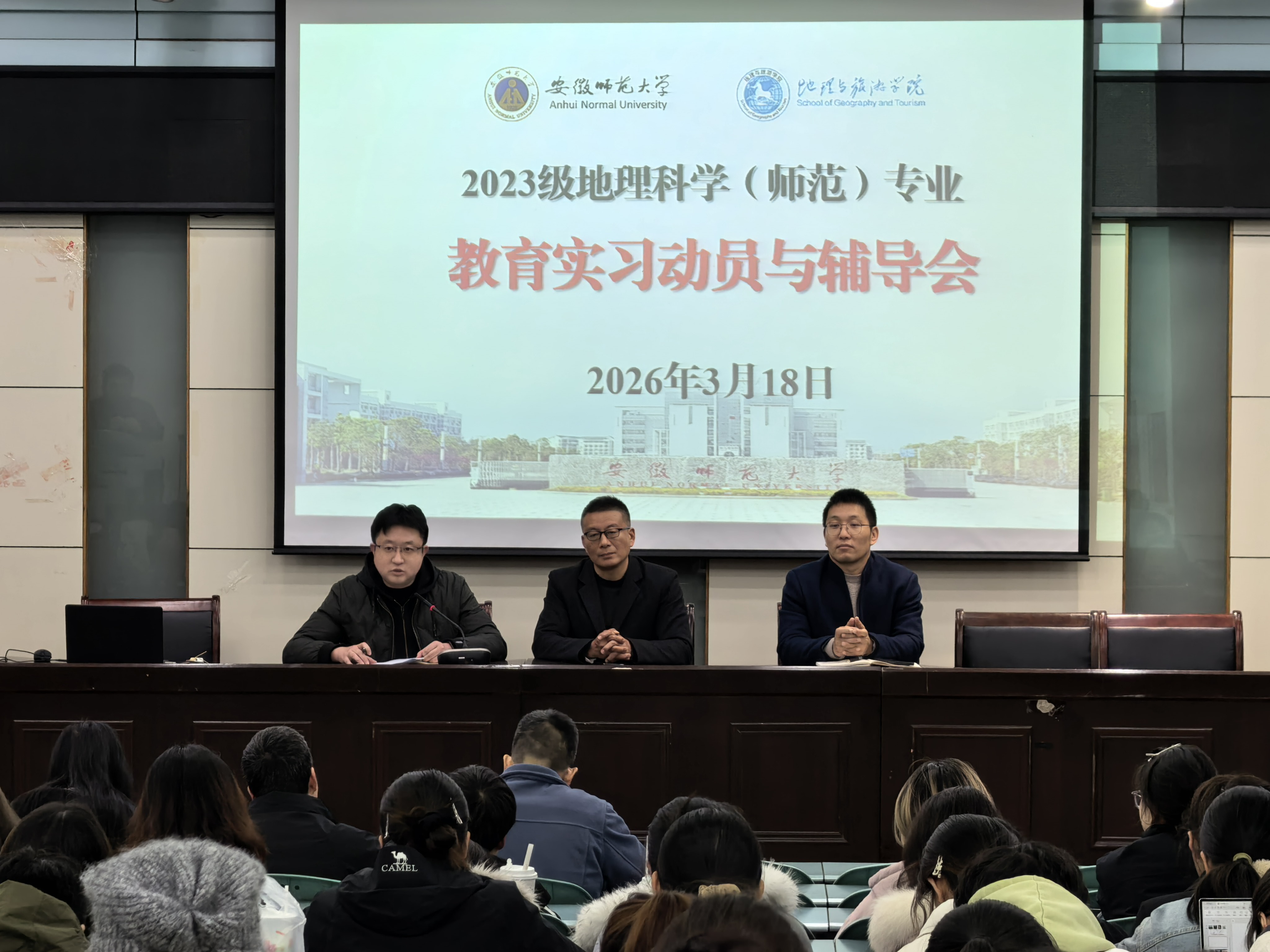 在实验楼101报告厅召开2023级地理科学(师范)专业教育实习动员大会。嘟嘟成人网党委副书记钱程、副院长孙鹏,实习指导教师组组长朱永恒,各实习小组指导教师,辅导员及2023级地理科学(师范)专业全体学生参加会议。