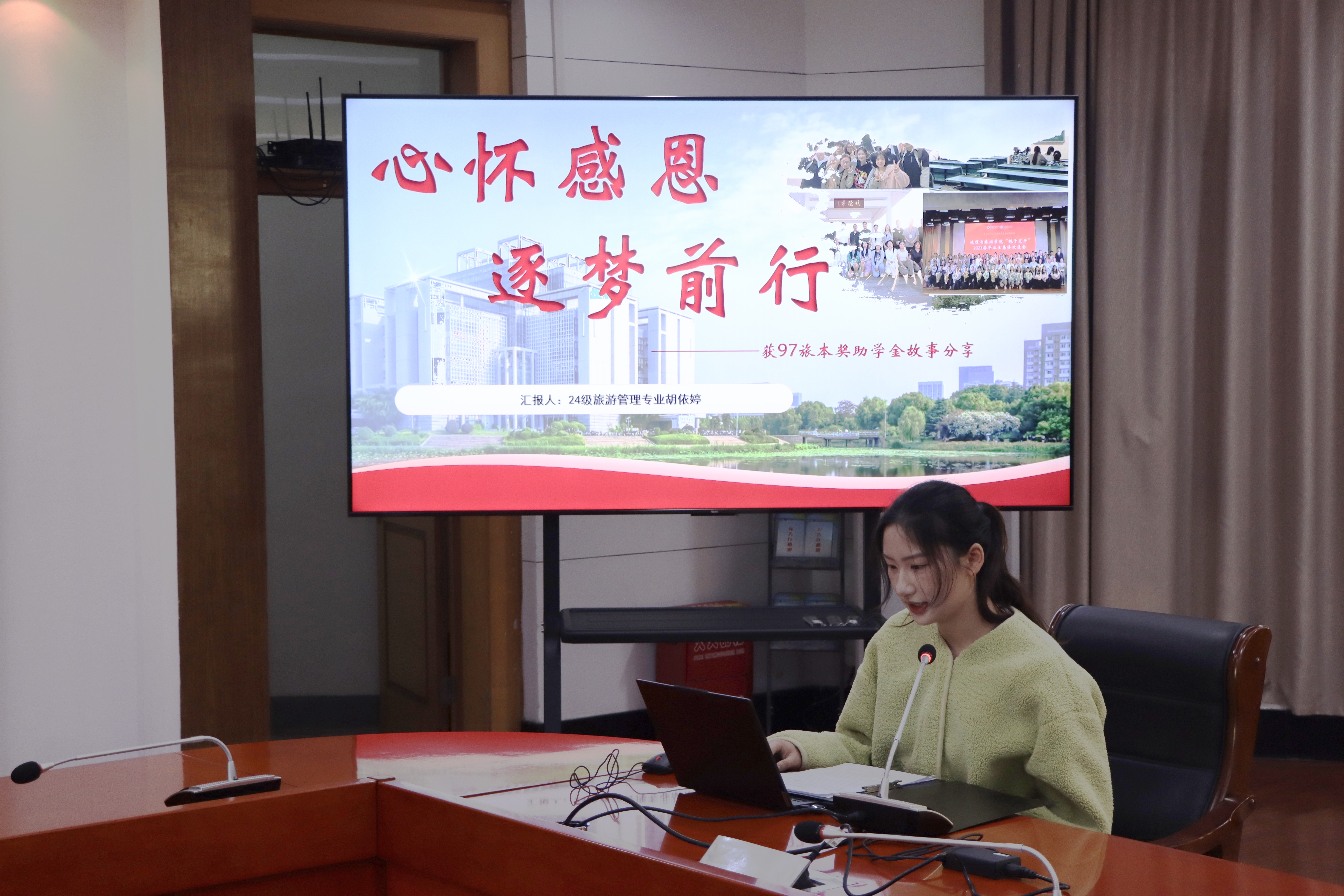 在交流阶段,2022级旅游管理专业倪壁君以“琢磨成器 怀璞向善”为题,分享了勤学求知、履职担当、实践砺能、奉献传爱的成长历程,她已推免至南京师范大学,将带着鼓励深耕专业知识、反哺社会。2024级旅游管理专业胡依婷以“心怀感恩 逐梦前行”为题,讲述了在学校与校友关怀下的成长故事,她会立志扎根家乡、投身乡村旅游,将爱心接力传递。