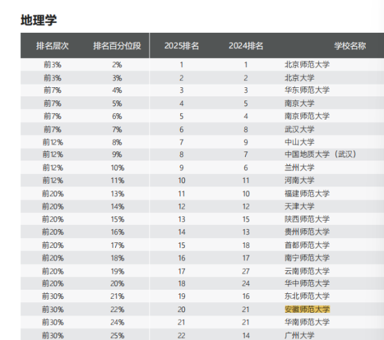 地理学学科以优异表现位列全国第20名,师范类高校第12名。排名连续跻身全国前30%行列,综合排名较去年提升1个名次。这是我校地理学学科排名首次进入全国前20名行列。