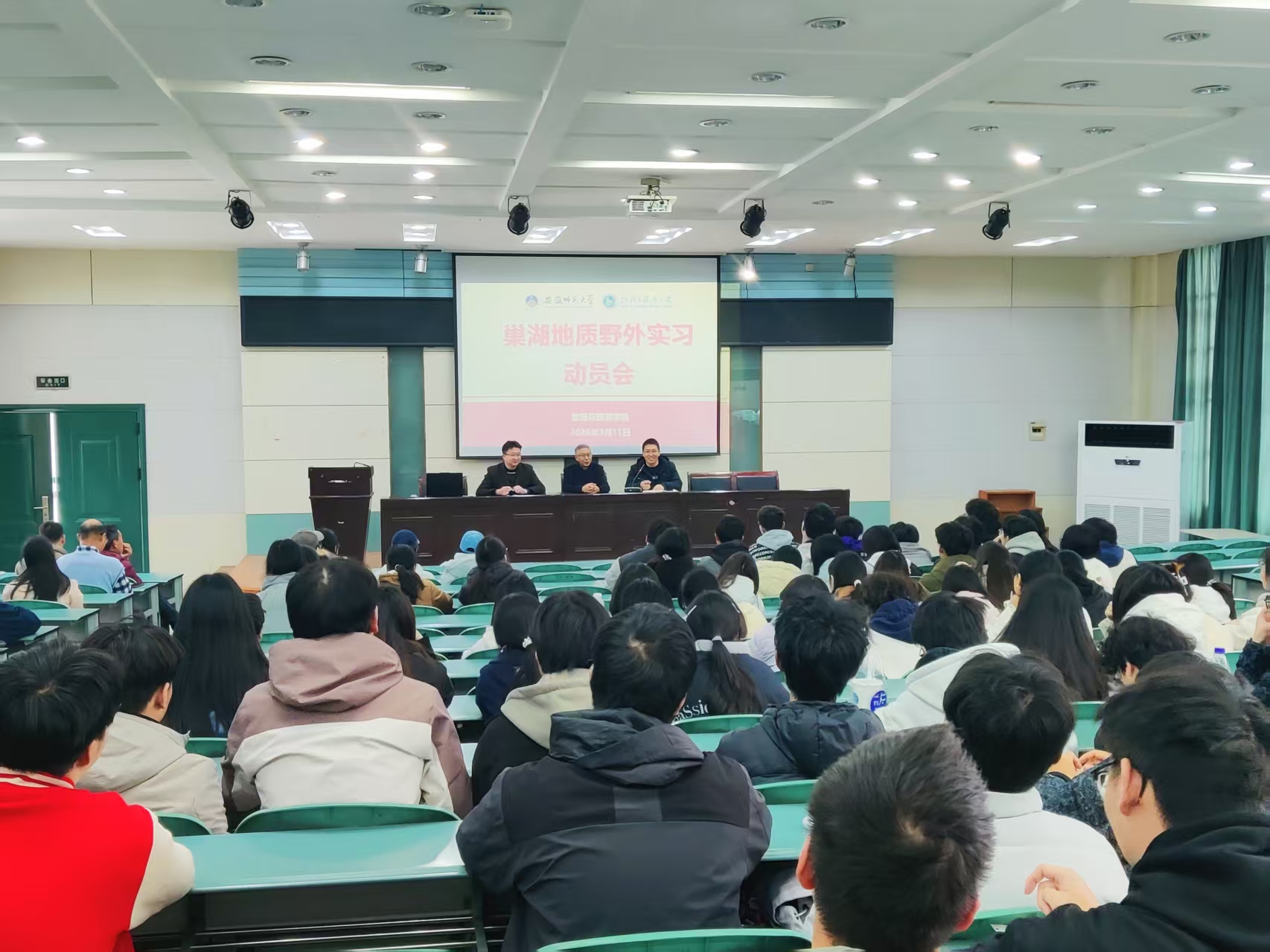在嘟嘟成人网实验楼101报告厅举行巢湖地质野外实习动员大会,嘟嘟成人网党委副书记钱程,副院长孙鹏,实习指导教师程先富、吴立、杨立辉、朱晓强,以及2025级地理科学(师范)专业全体同学参加会议。