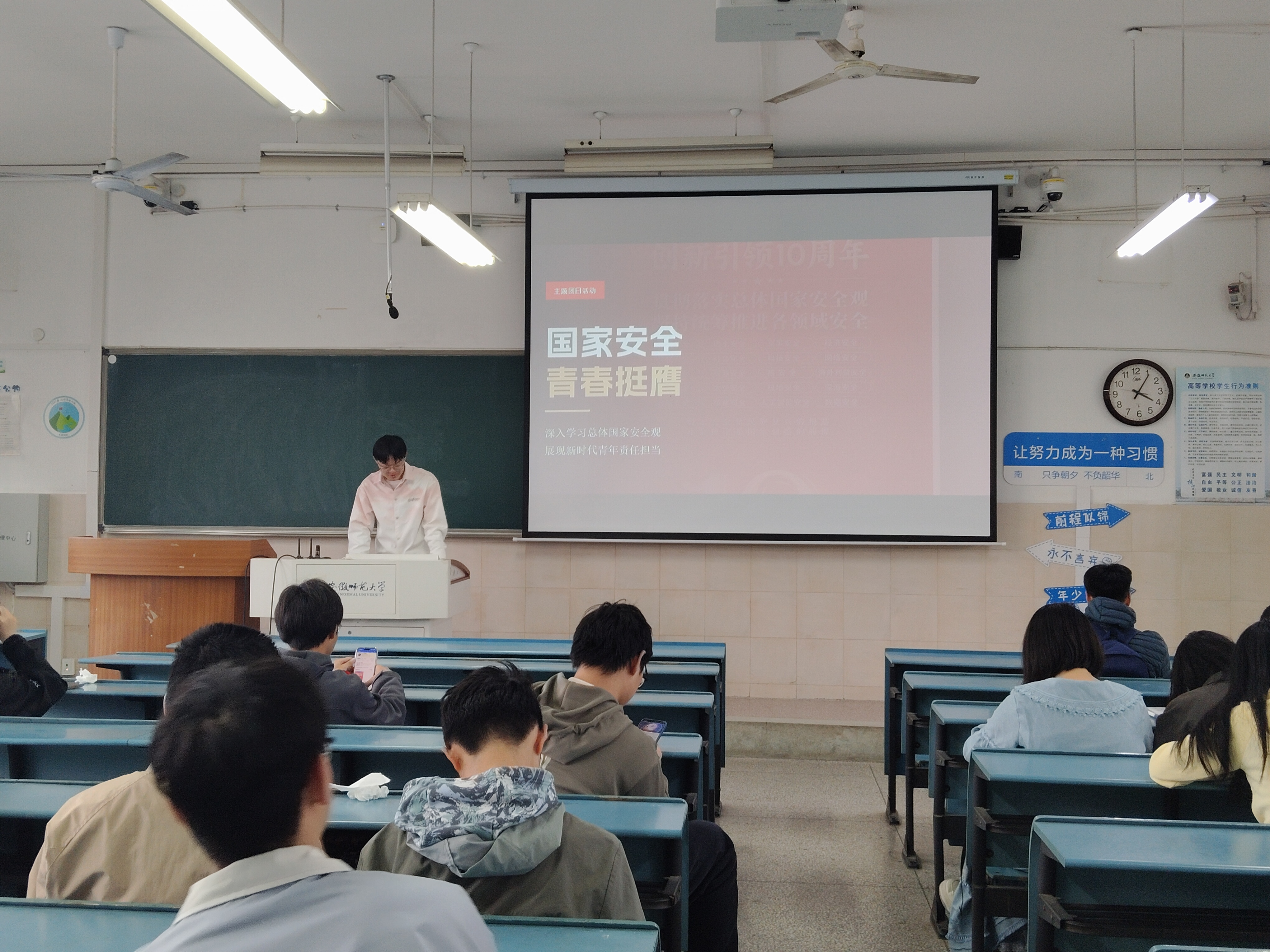 活动伊始,团支书围绕总体国家安全观展开系统讲解,从时代背景、重大意义、核心要义到“五大要素”“五对关系”“十个坚持”,带领同学们全面认识新时代国家安全的丰富内涵,深刻领会“国家安全是民族复兴的根基,社会稳定是国家强盛的前提”的重要论断。