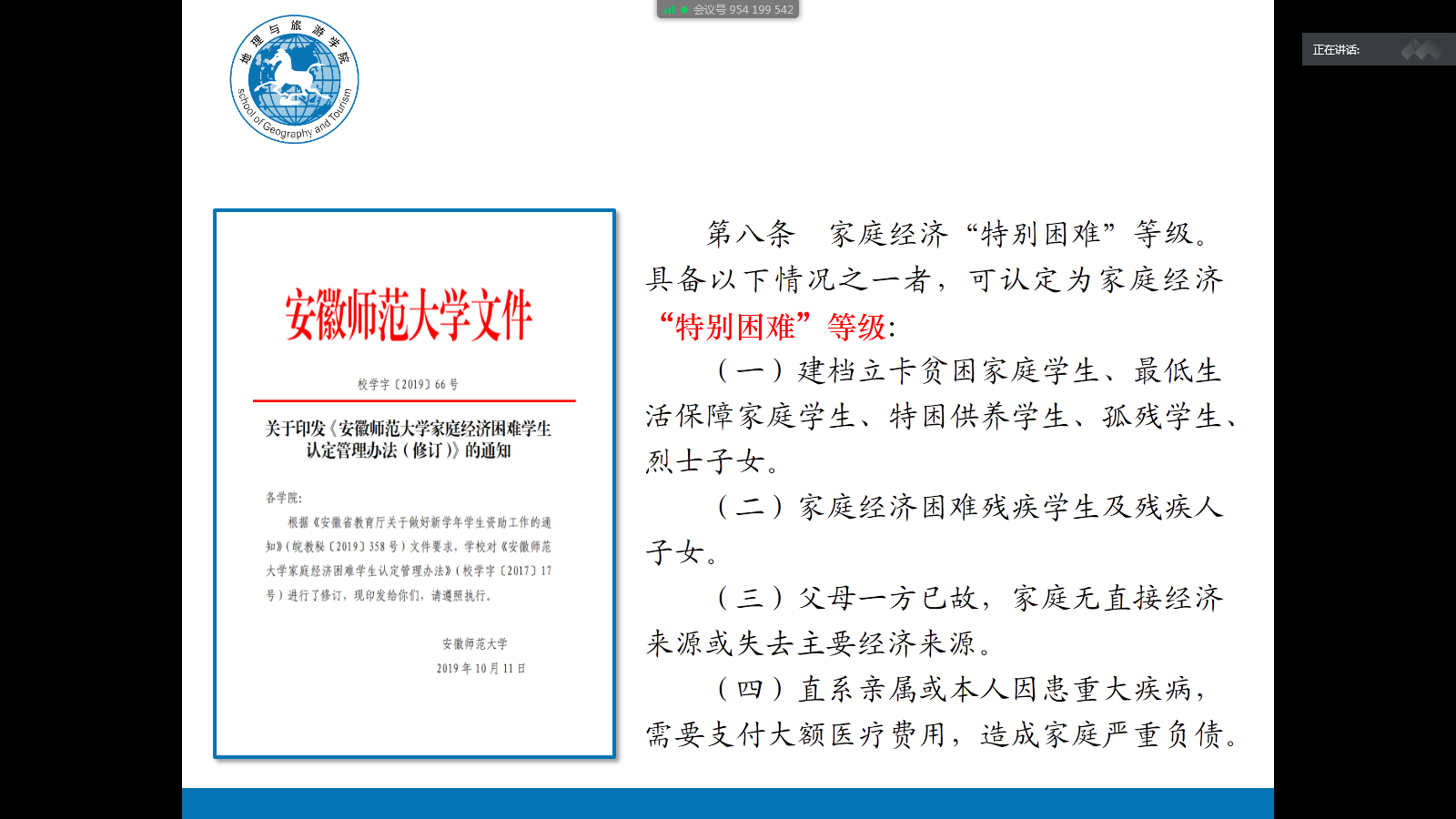 家庭经济困难学生认定管理办法(修订)》文件精神,强调大家一定要高度重视家庭经济困难学生认定工作,对国家、学校和申请学生负责,坚持实事求是、客观公平、公开透明、保护隐私的原则,扎实做好认定工作,让班级每一个家庭经济困难学生都能够得到国家的资助、学校的关爱、嘟嘟成人网的关怀,感受到班级和同学们的温暖。