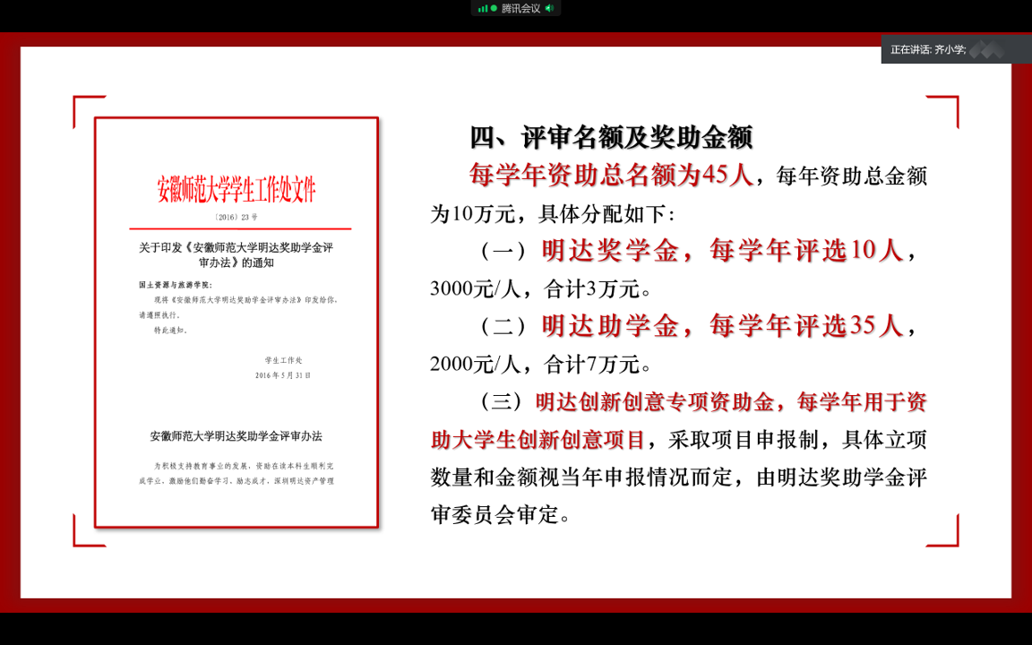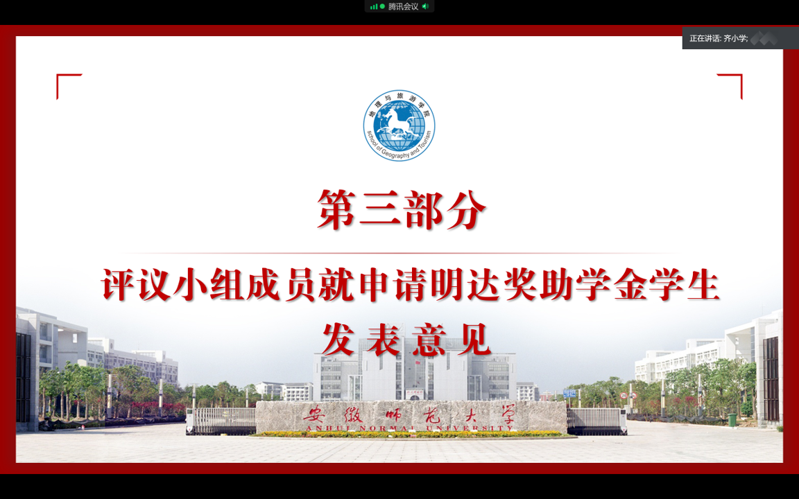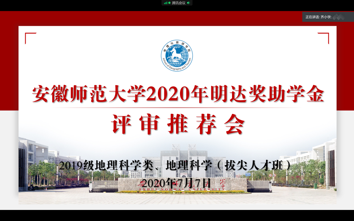 本网讯(地旅嘟嘟成人网 齐小学)7月7日晚,2019级地理科学类1班、2班和2019级地理科学(拔尖人才班)利用腾讯会议网络平台,顺利召开明达奖助学金评审推荐会,各班级评议小组全体成员参加会议。会议由评议小组组长、辅导员齐小学主持。