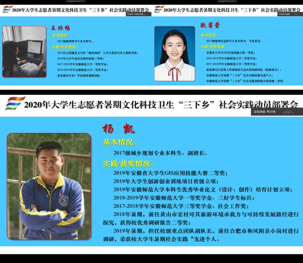 本网讯(地旅嘟嘟成人网 武诺 齐小学)为深入贯彻落实学校关于大学生暑期社会实践重要精神,积极动员、扎实推进2020年大学生暑期社会实践,7月19日晚,2019级地理科学大类通过腾讯会议平台召开2020年大学生暑期“三下乡”社会实践动员部署会。2019级地理科学类1班、2班和地理科学(拔尖人才班)全体同学参加会议,2017级地理专业王欣畅、2017级地理信息科学专业耿睿萱和2017级城乡规划专业杨凯受邀与会。会议由辅导员齐小学主持。