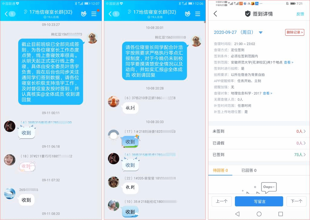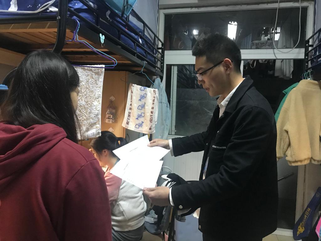 本网讯(地旅嘟嘟成人网 章莹莹)为引导同学们扎实推进疫情防控常态化,以及更好落实秋季安全宣传教育工作,排查安全隐患,10月16日在辅导员韩红豆带领下,2017级地理信息科学专业开展寝室安全突击检查,谢煜欣、耿睿萱等班委陪同。