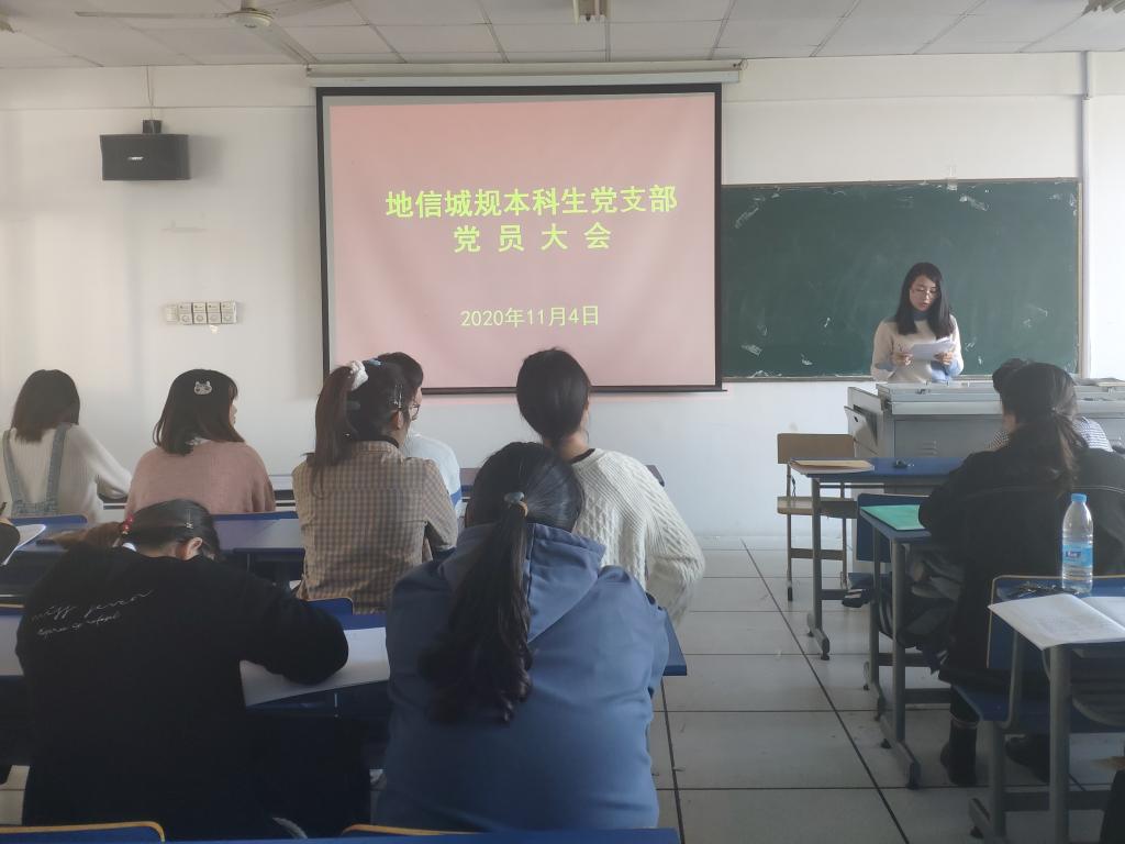 地信城规本科生党支部在嘟嘟成人网实验楼201教室召开支部党员大会,会议讨论表决接收预备党员相关事宜。大会应到14人,实到12人,其中有表决权的党员应到8人,实到6人。会议由支部书记彭媛媛主持。