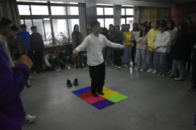 活动第二项,猜歌活动。所有同学按照小组围成一个大圈,音箱播放一首歌曲节选,音乐停止后,同学们上台抢夺话筒并正确唱出下一句即为答对,该队记一分。同学们积极参与,跟着合唱一些耳熟能详的歌曲,场面热闹非凡。经过几轮的角逐,第四组同学取得了胜利。根据规则,该组同学获得了提前准备的零食奖品,而得分较低的第二组则要接受指压跳绳板惩罚。令同学们意想不到的是很多同学甚至跃跃欲试,勇敢挑战指压板。