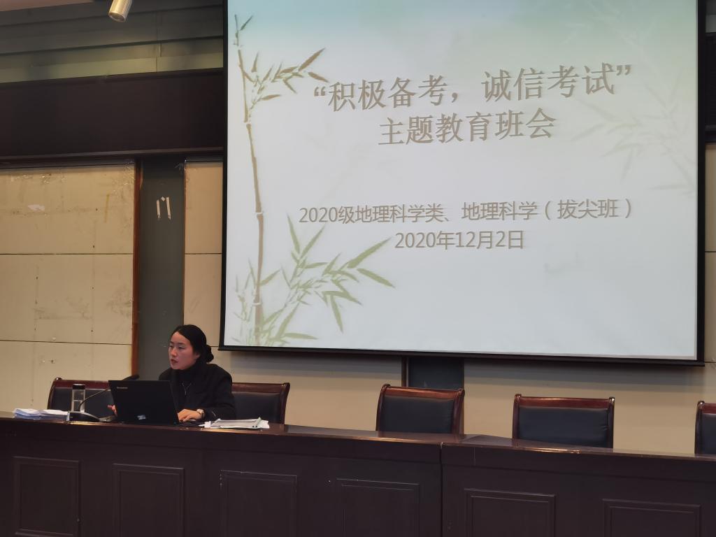 实验楼101会议室召开“积极备考,诚信考试”主题教育班会,地旅嘟嘟成人网2020级地理科学类和地理科学(拔尖班)全体同学参加会议。会议由辅导员彭媛媛主持。