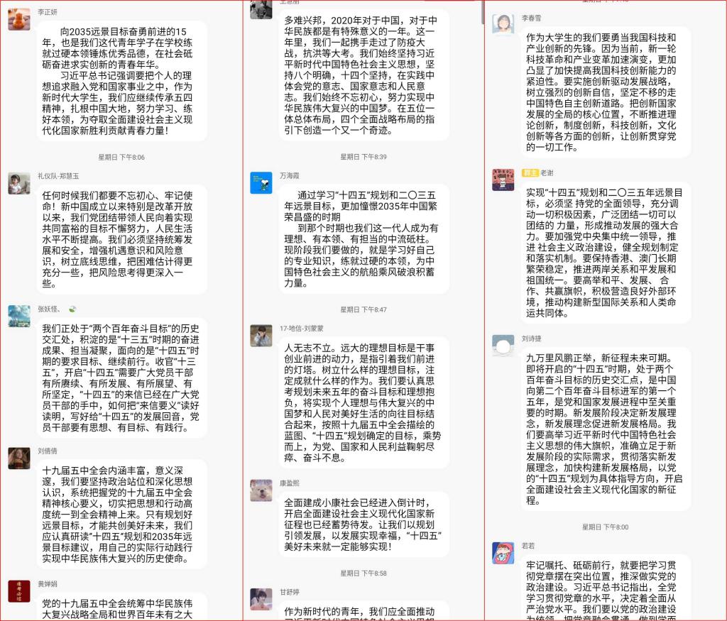 班级组织开展线下线上相结合交流研讨活动,同学们纷纷发表学习心得。刘诗捷说“我们要高举习近平新时代嘟嘟成人网