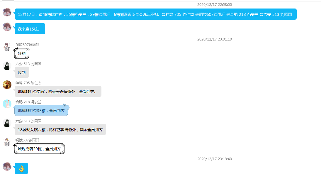 寝室长会议上,张慧指出每位同学都需要一个健康整洁、充满学习氛围的寝室环境,而这离不开寝室长的有效管理。随后,张慧结合近期地旅嘟嘟成人网查寝情况,强调了寝室安全和卫生的重要性。她表示,寝室长要做好提醒工作:出门关电源、晨午晚测温、按时健康打卡、及时完成线上晚点名;寝室长还需如实报备寝室成员状况,定期开展卫生打扫和安全排查工作,确保每位同学的安全。后期将会安排生活委员、安全委员等班委进行晚归不归突击查寝,并不定期检查每个寝室的卫生状况。