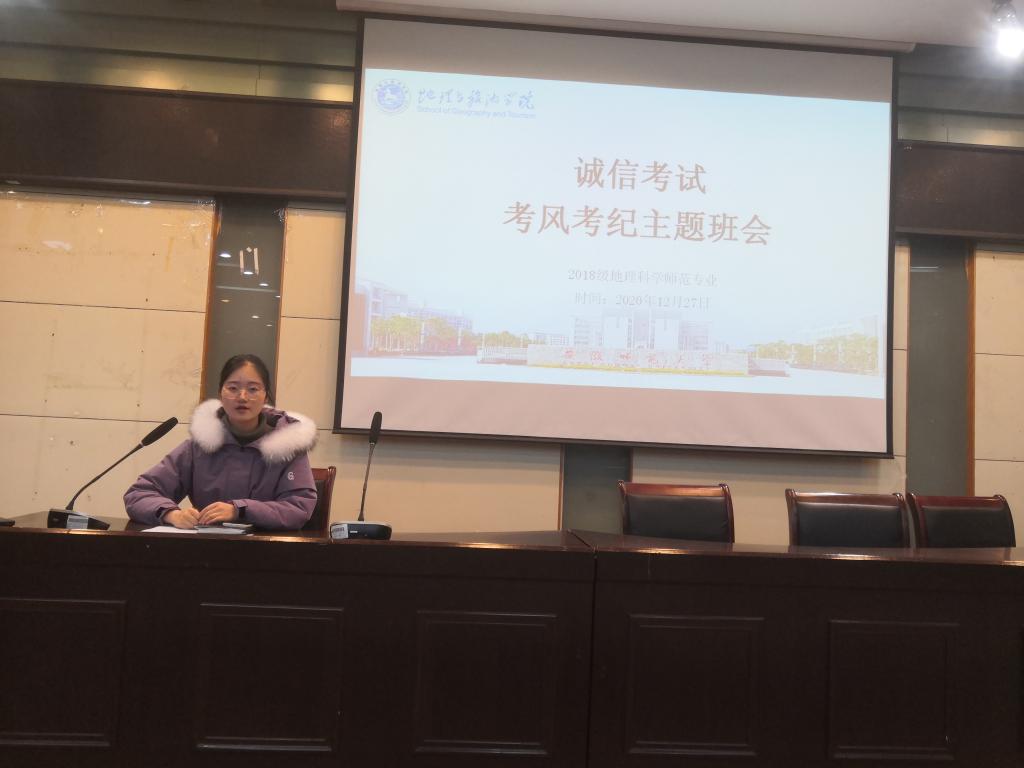 本网讯(地旅嘟嘟成人网 丁茹栩 罗文菁)营造考试氛围,强化法纪观念。2020年12月27日晚上七点半,2018级地理科学(师范)专业考风考纪教育主题班会在地旅实验楼101报告厅顺利举行。班会由辅导员丁茹栩主持。