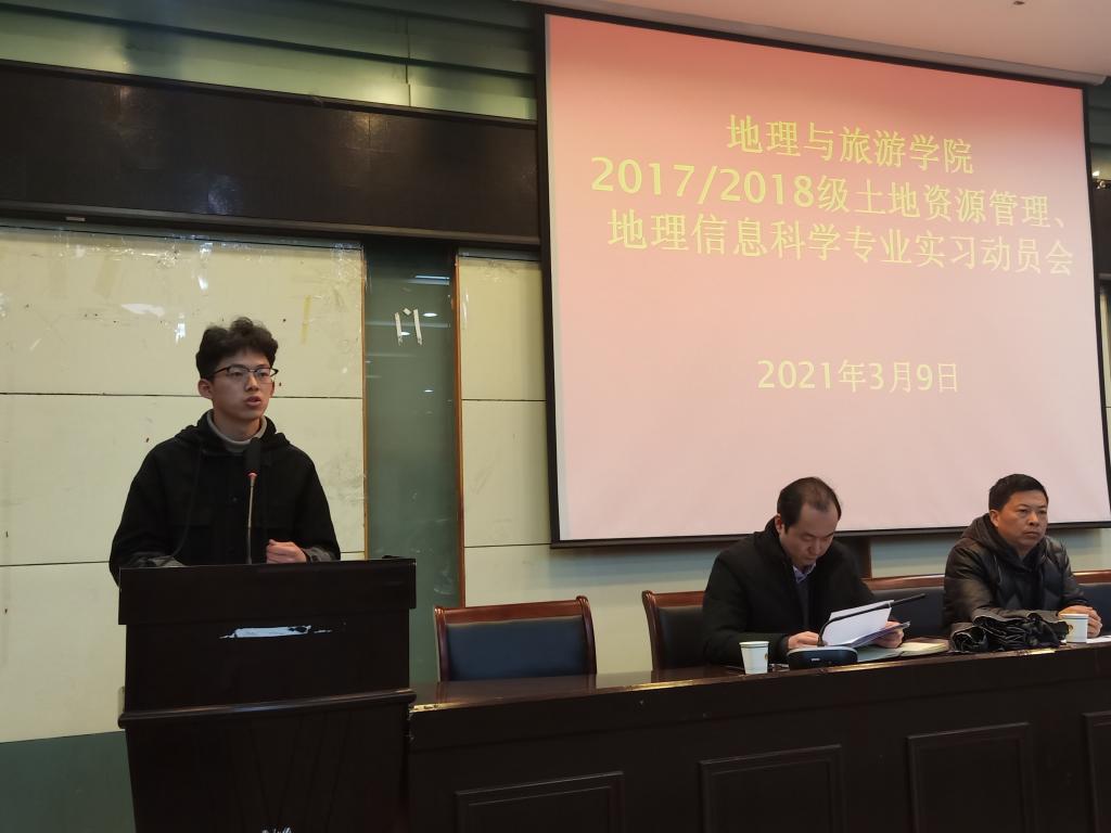 最后2018级地理信息科学专业汪岩作为实习生代表进行发言,他号召同学们展现自身的道德文化修养和科学文化储备,将知识所学运用到社会服务、价值生产、文明创新和市场经济中去。同时,他向同学们提出五点要求,在工作上恪尽职守、爱岗敬业、在实践中勤恳学习、树立良好的道德素养、注意安全,通过这五点要求来实现实习的价值。汪岩的慷慨演讲,引起同学们的强烈共鸣,也安抚了同学们内心的紧张与焦虑。