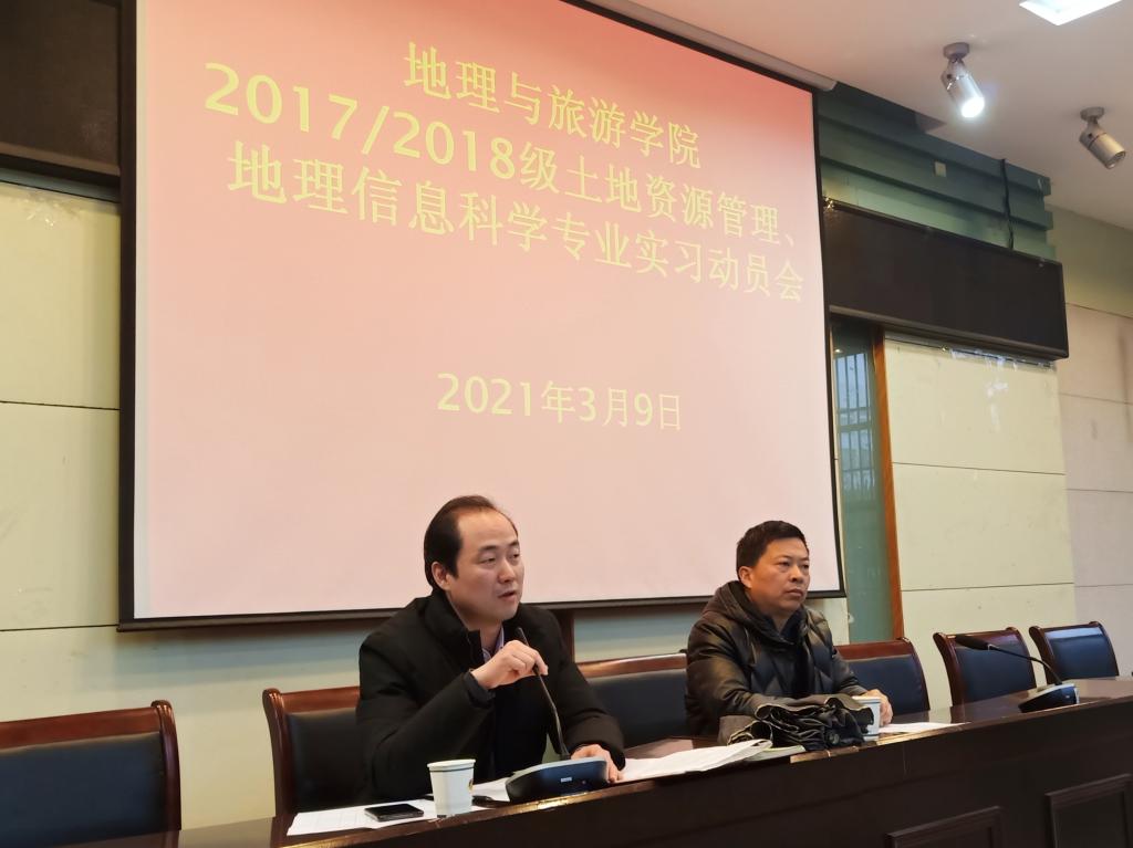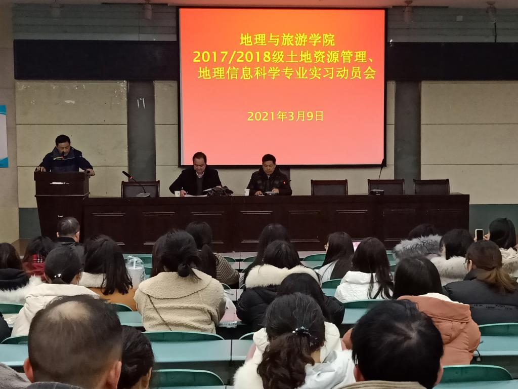 实验楼101召开专业实习动员会。院长曹卫东、院党委副书记乔静,嘟嘟成人网专业老师汪左、吴庆双、张运、徐培培、贾蔡、梁栋栋、费罗成、鲁成树、肖瑛、李陈、王满银、罗遥、吴九兴、余健、程久苗、徐玉婷,2018级地理信息科学辅导员彭媛媛参加会议,会议由张运主持,2017、2018级土地资源管理、地理信息科学专业全体同学参与。
