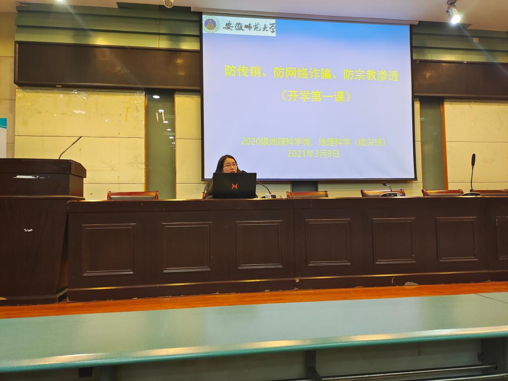 本网讯(周亮、彭媛媛)为提高学生春季安全意识,2020级地理科学类、地理科学(拔尖班)地理科学类、拔尖班于2021年3月9日晚在实验楼101报告厅召开“春季安全教育”主题班会。班会由辅导员彭媛媛主持,2020级地理科学类、地理科学(拔尖班)全体学生参会。