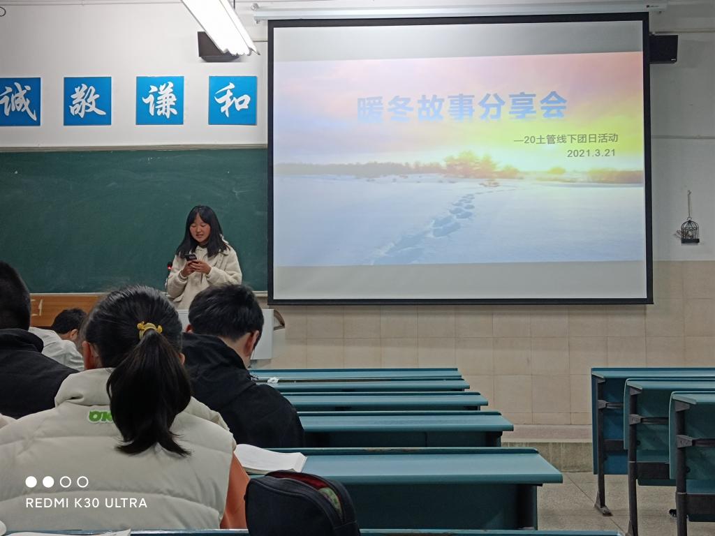 史、改革开放史、社会主义发展史,了解世情国情、社情民情,在服务奉献中厚植家国情怀,在实践锻炼中受教育、长才干、做贡献,检验同学们的寒假社会实践成果,3月21日晚,20级土地资源管理开展了暖冬故事分享会主题团日活动。此次分享会由宣传委员陆峻然主持,辅导员刘少杰和全体同学参加。