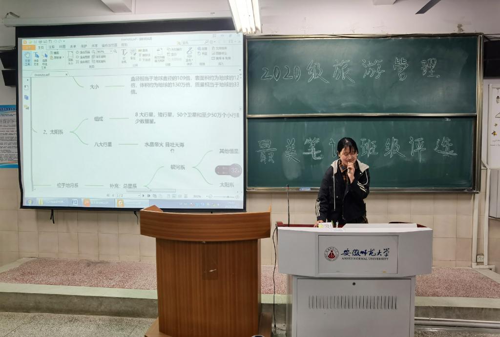 活动一开始,徐晖介绍了活动背景及相应规则,此次活动共有五名选手参赛。活动依据笔记内容、字迹、选手现场表现等方面对五名选手进行总体测评,由全体同学选出三位自己心目中“最美笔记”。活动中,五名参赛选手冯可、吐尔洪阿义、高雅迅、徐程雯、徐雨霏依次展示了自己旅游目的地管理、自然地理学、高数等课程的笔记。冯可在笔记中给自己标记问题答案帮助理解笔记内容;吐尔洪阿义把重点用图形和图标来形象展示;高雅迅将重点划线并在高数笔记采取从书中摘抄的方式帮助记忆;徐程雯将高数题的步骤清晰记录并加一以知识点总结;徐雨霏通过做思维导图帮助逻辑记忆。