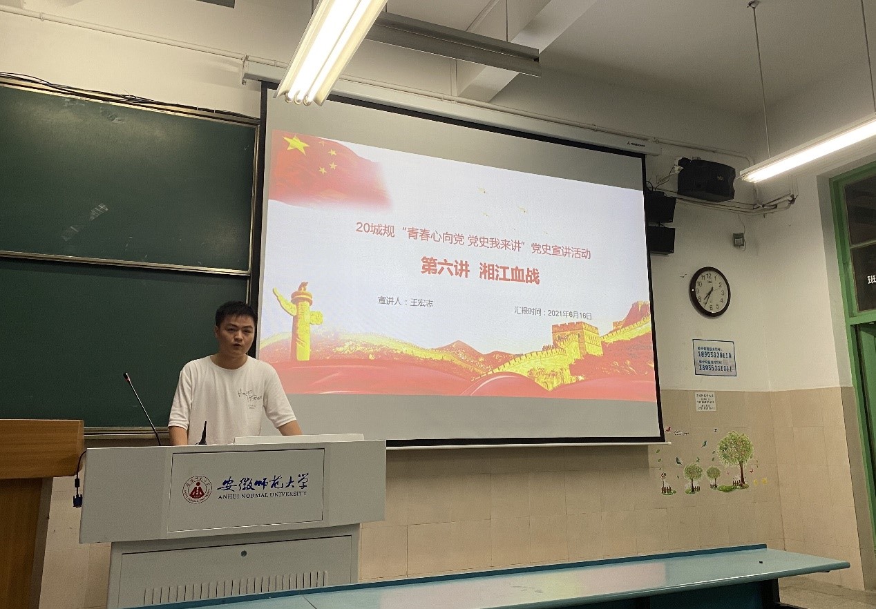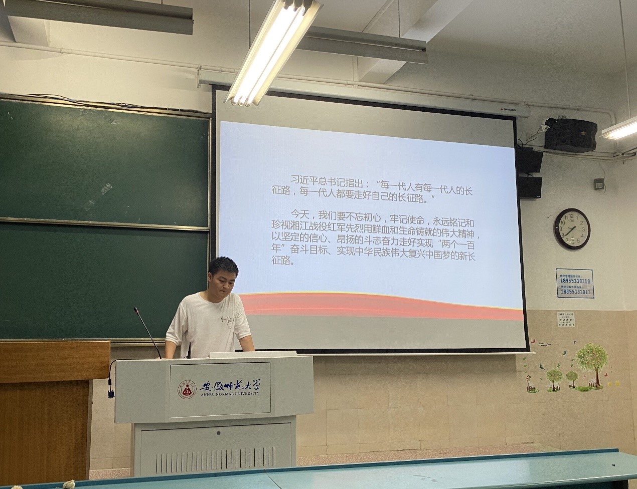 本网讯(地旅嘟嘟成人网 刘少杰 耿艺榕)为全面贯彻落实习近平总书记在党史学习教育动员大会上的重要讲话,积极响应“学史明理、学史增信、学史崇德、学史力行”的号召,推动“学党史、强信念、跟党走”学习教育持续深化,强化爱国主义教育。6月16日晚七点半,2020级城乡规划班“青春心向党 党史我来讲”党史宣讲主题活动第六讲开讲。本次主讲人为入党积极分子王宏志,主题为《湘江血战》。