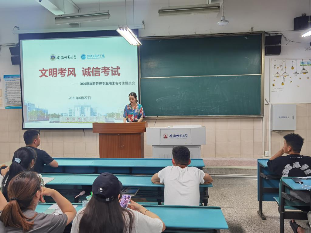 本网讯 (地旅嘟嘟成人网 赵佳慧 孙云峰)期末考试临近,为树立优良学风,严格考风考纪,6月28日晚七点,2020级旅游管理专业在行知楼4号楼203教室召开“文明考风,诚信考试”主题班会。班会由辅导员赵佳慧主持,2020级旅游管理专业全体同学参与。