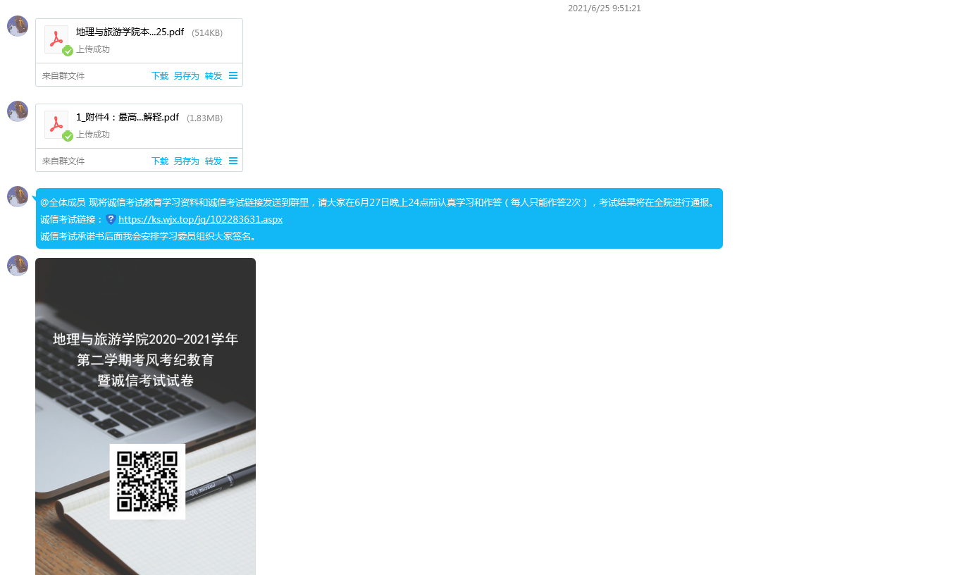 本网讯(地旅嘟嘟成人网 张慧 李娜 潘爽)2021年6月23日晚,2018级地理科学(非师范)专业及2018级城乡规划专业“严于律己 以诚参考”诚信考试主题班会在行知楼4号楼104顺利举行。班会由辅导员张慧主持,2018级地理科学(非师范)专业及2018级城乡规划专业全体同学参加。