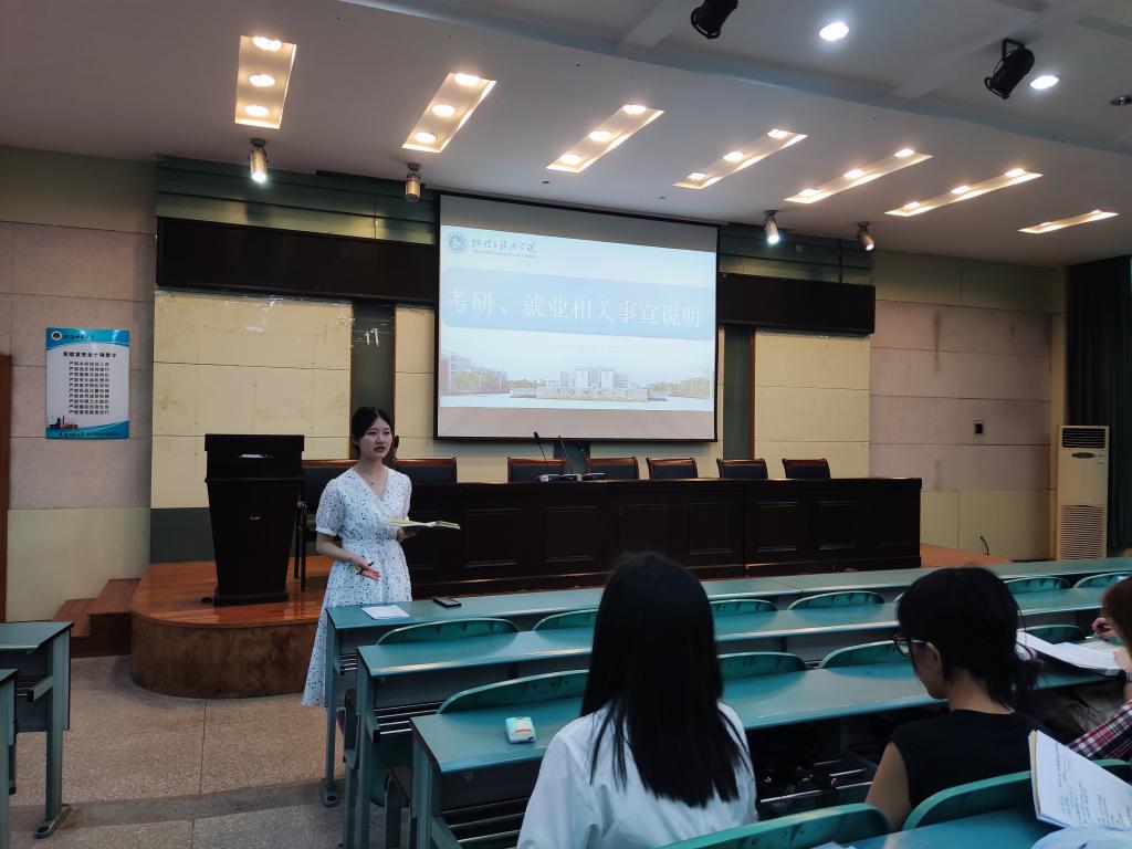 会议伊始,丁茹栩从国家政策和考研现状等几个方面为同学们指点迷津,建议同学们要结合自己的实际情况,选择一个适合自己的学校及专业,不可好高骛远;在假期制定相关学习目标和计划,积极备考,不忘初心,坚持奋斗,不可“三天打鱼,两天晒网”。她还鼓励同学们在考研过程中要放平心态,学会调节和控制焦虑情绪,做到劳逸结合,并对即将踏上考研之路的同学们给予期望和祝福。