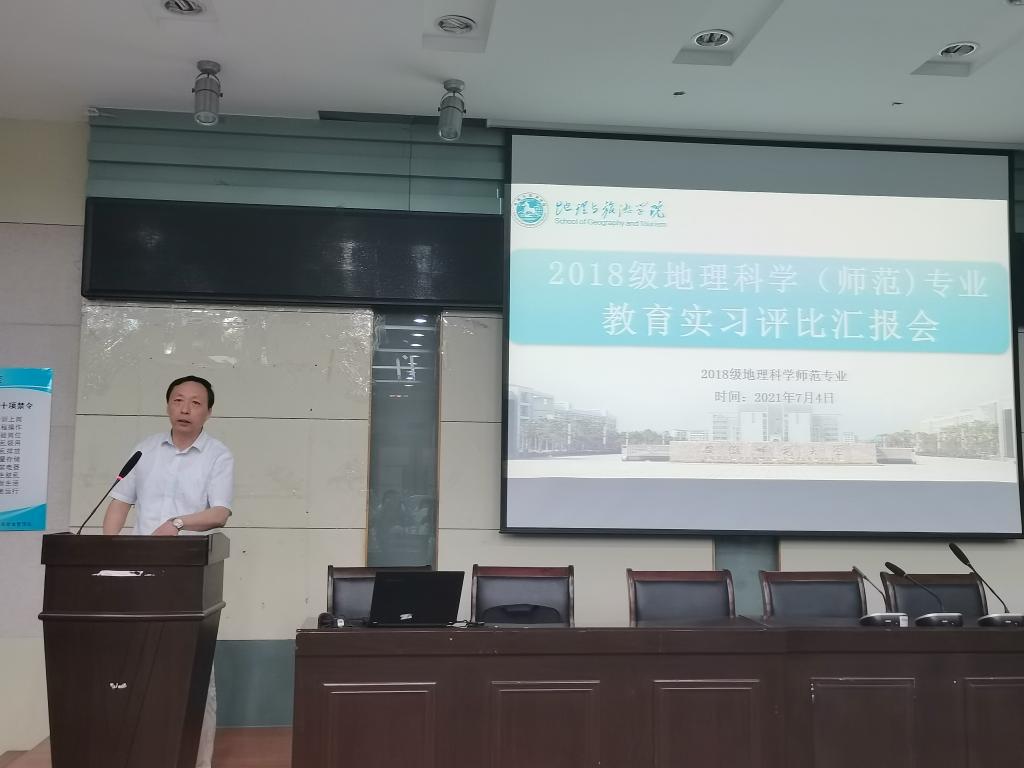 随后,由焦华富进行总结发言,他表示教育实习是师范生必须经历的一个过程,是师范生将理论与实际相联系,提高自身综合素质的一次锻炼。他肯定了同学们通过教育实习后,在知识积累和实践能力方面均有了提高,但是地理师范生不仅要加强自身专业和技能的学习,更重要的是应不断提高自身的综合素质与能力,学会如何做人与做事。会议最后,由张平究宣布此次汇报评比会的最终结果。
