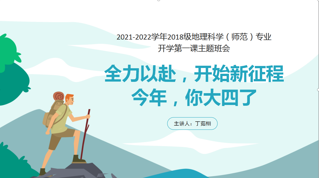 本网讯(地旅嘟嘟成人网 丁茹栩 张瑞清)全力以赴话未来,斗志开启新征程。2021年9月27日17点,2018级地理科学(师范)专业在地旅嘟嘟成人网实验楼101报告厅举行主题为“全力以赴,开始新征程”的开学第一课。班会由辅导员丁茹栩主持。